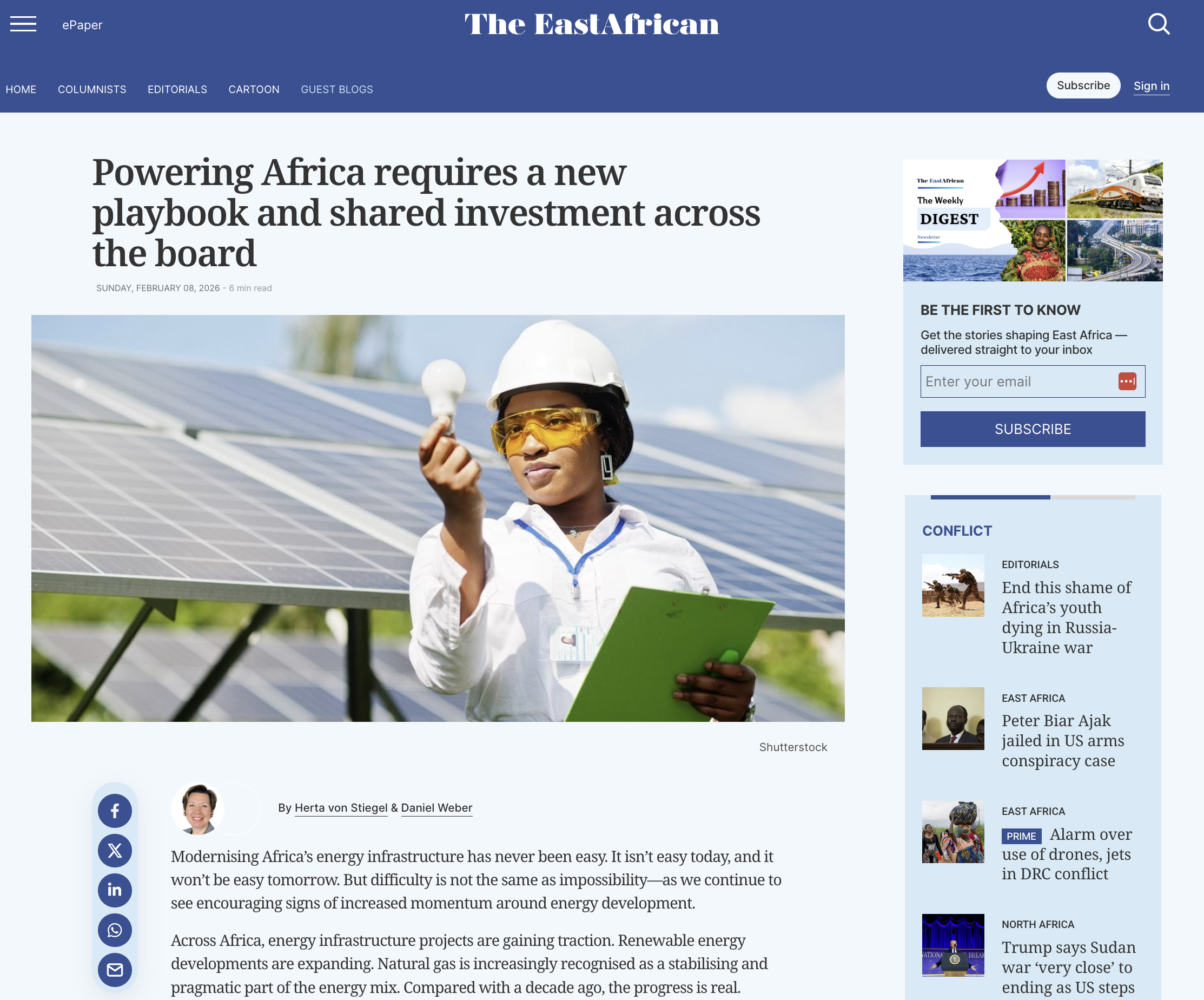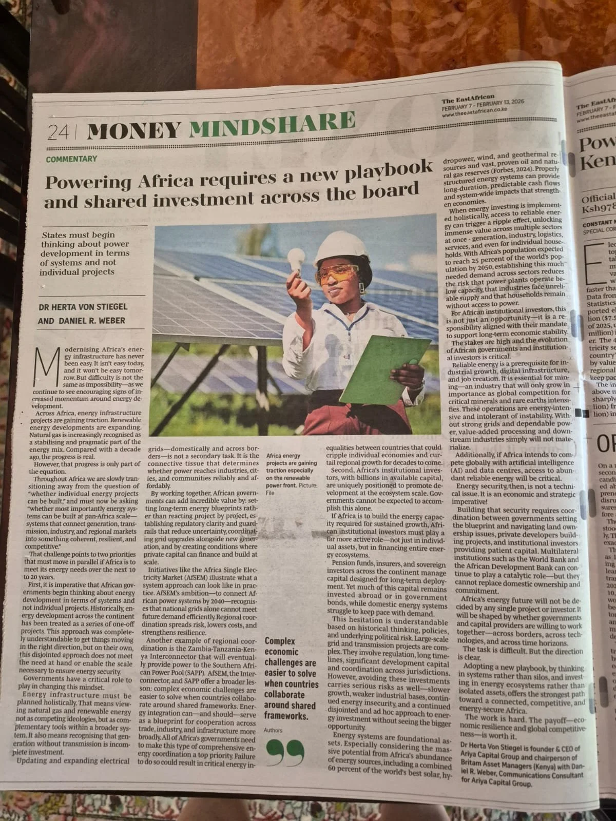 In her latest East African op-ed, Ariya Capital’s Founder and CEO Dr. Herta von Stiegel, alongside Daniel R. Weber, argues that to meet the continent’s energy needs, we must shift from isolated projects to fully integrated systems — and unlock the role of Africa’s own institutional investors in making that happen.