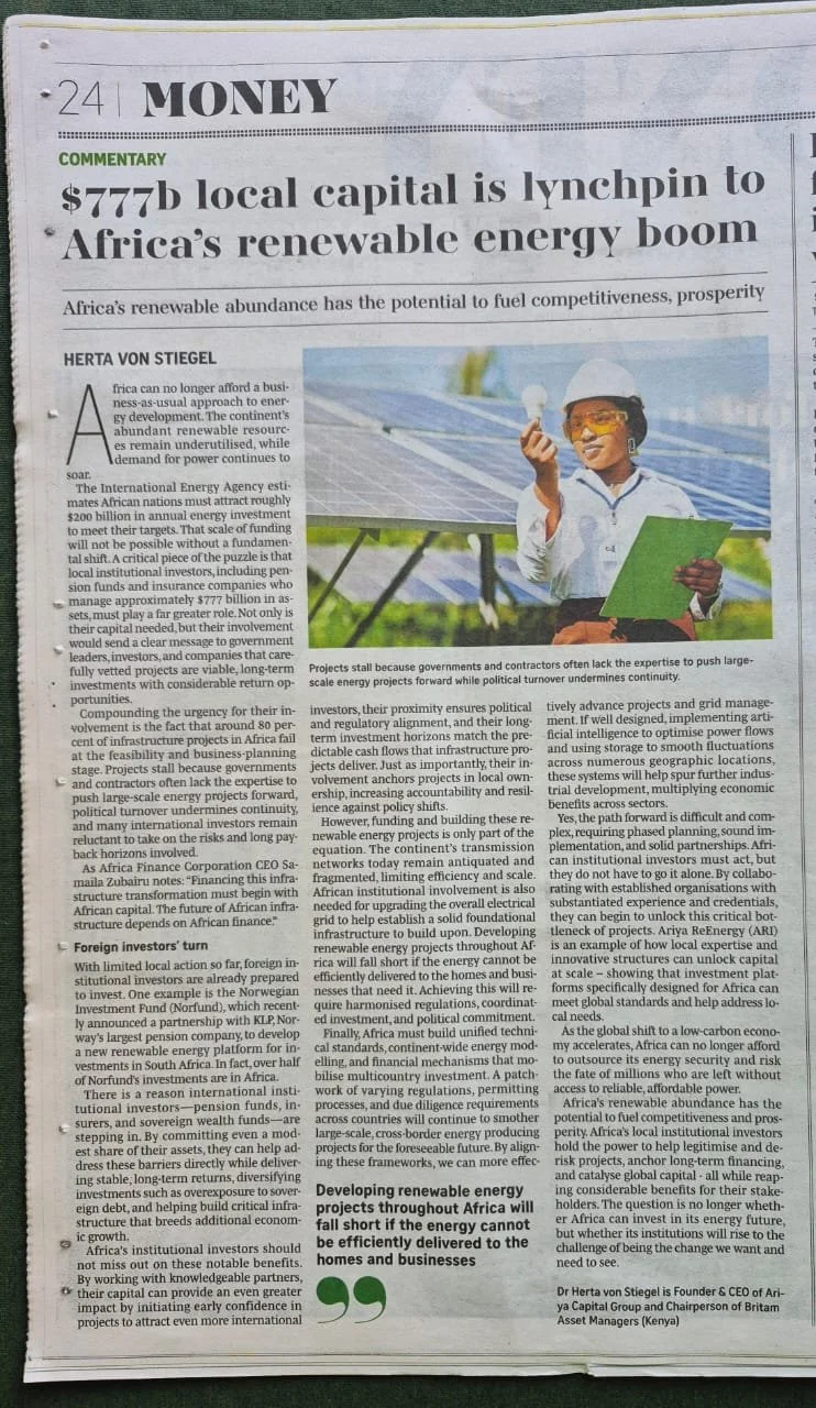 In a new op-ed published by The East African, Dr Herta von Stiegel, Founder and CEO of Ariya Capital Group, highlights the crucial role of Africa’s institutional investors in driving the continent’s clean-energy transition. With over $777 billion in assets under management, Africa’s pension funds and insurers have the power to legitimise and de-risk renewable energy projects while delivering meaningful long-term returns for their stakeholders.